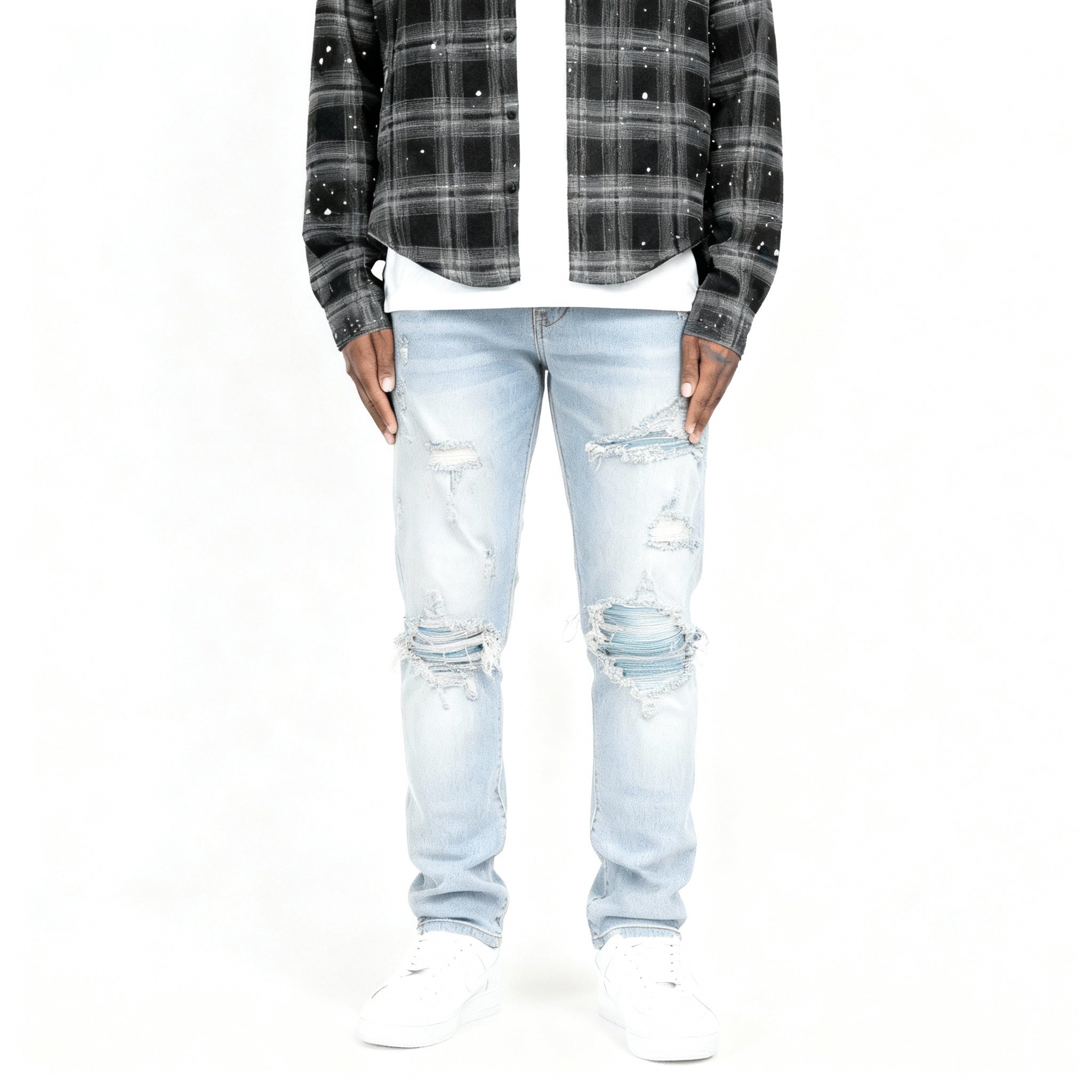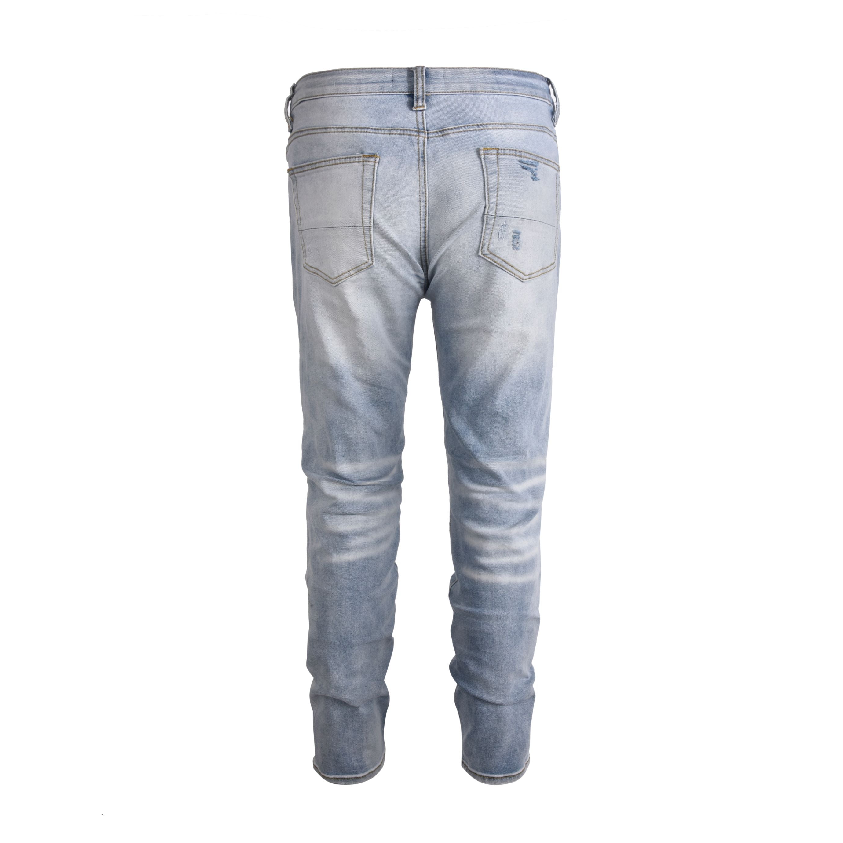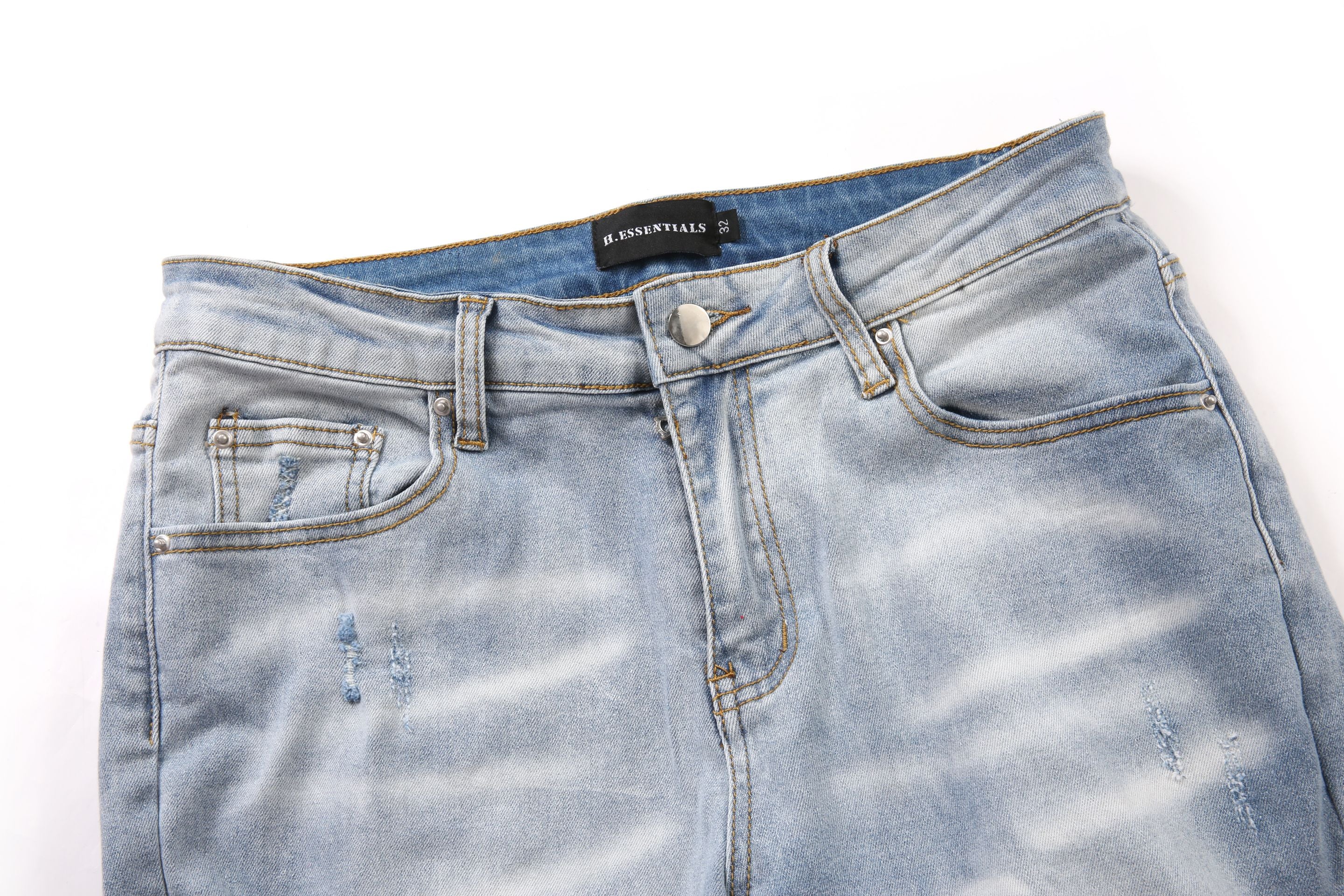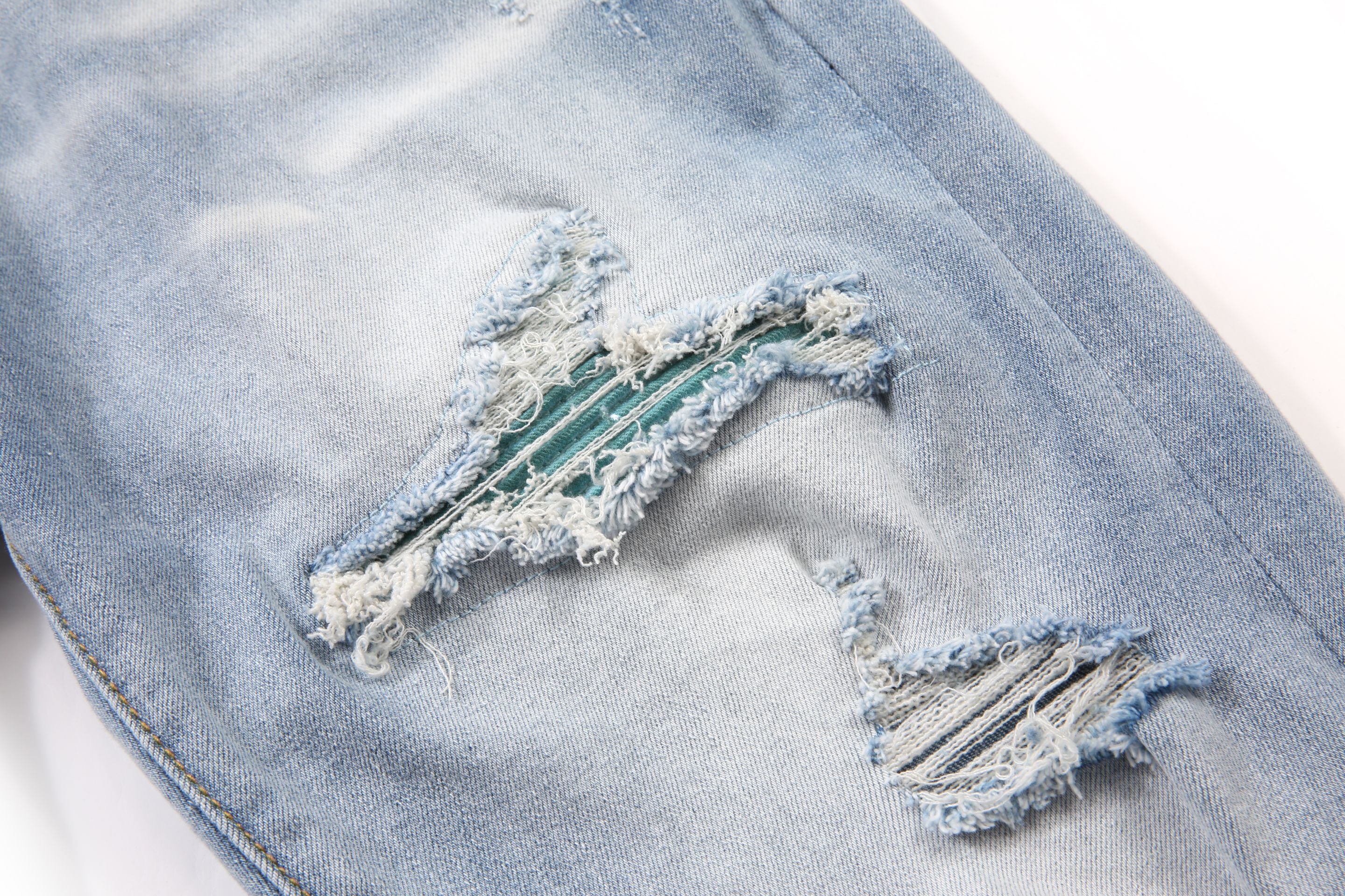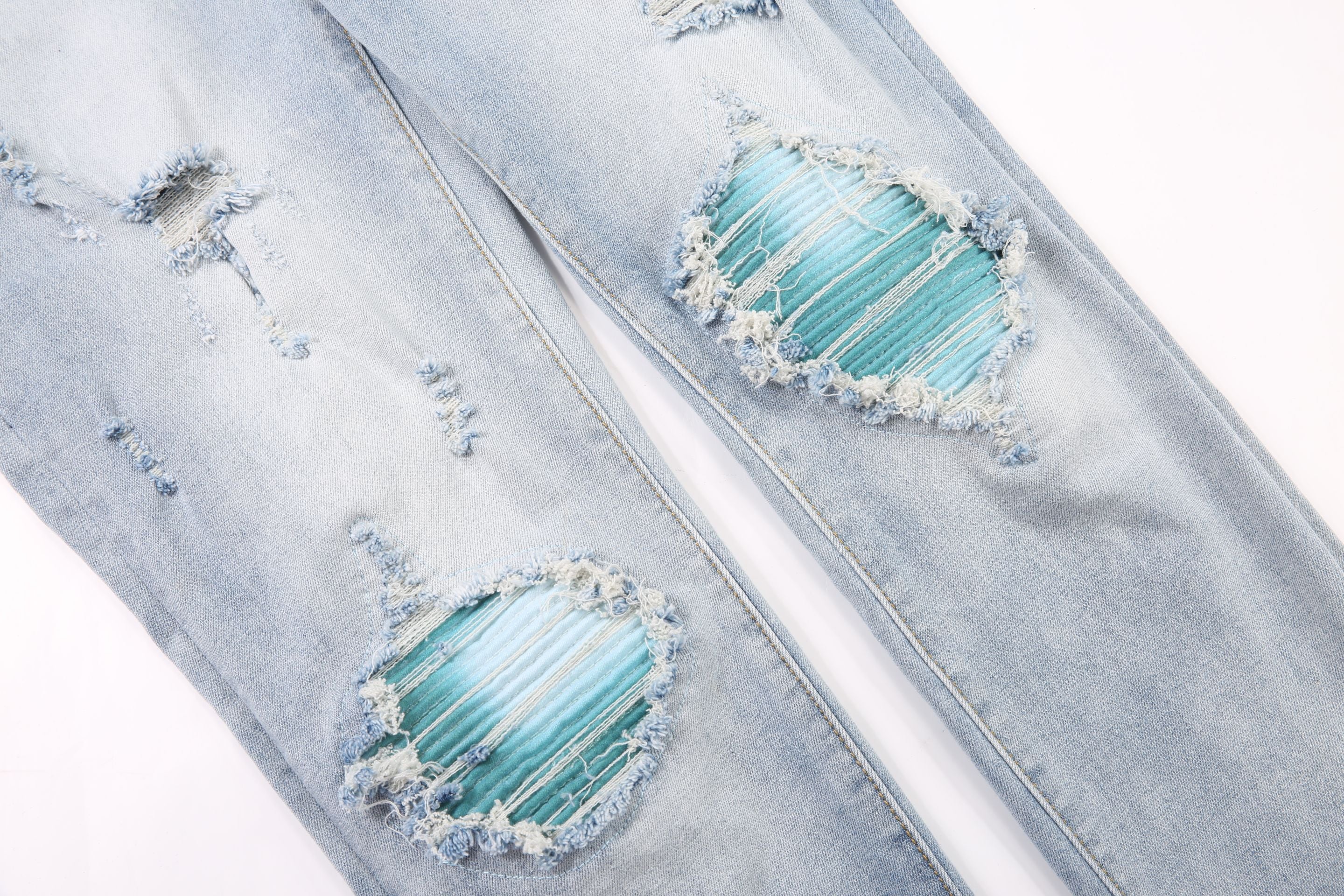 • denim blu lavato con baffi bianchi rovinati e nido d'ape.