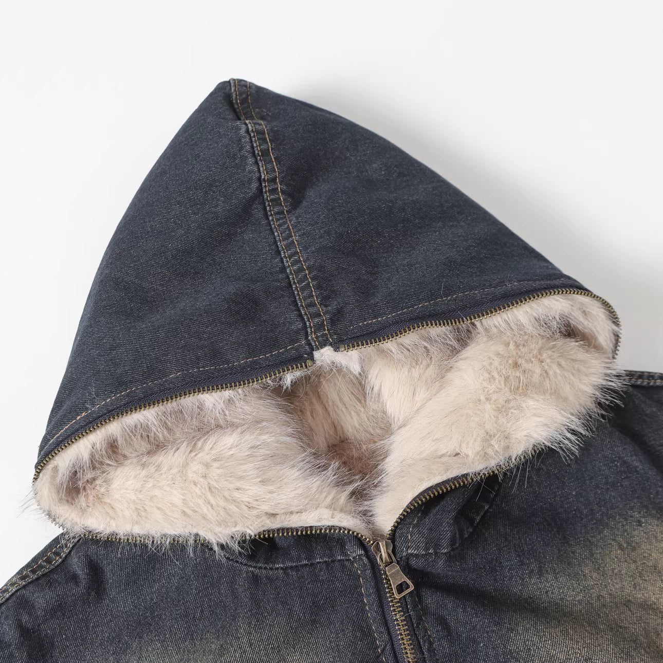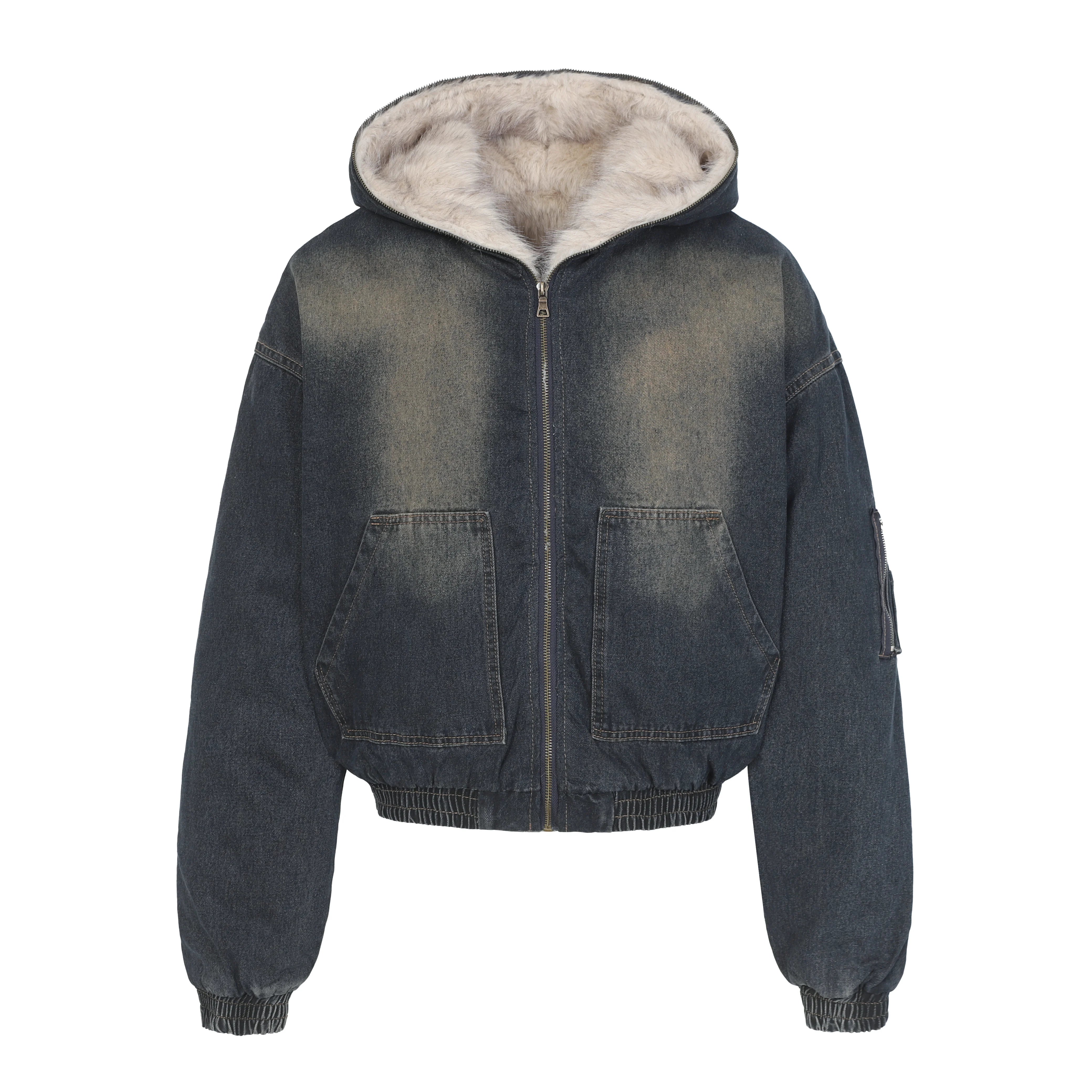 Giacca in denim squadrata con pelliccia | Denim lavato