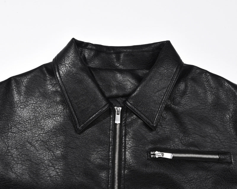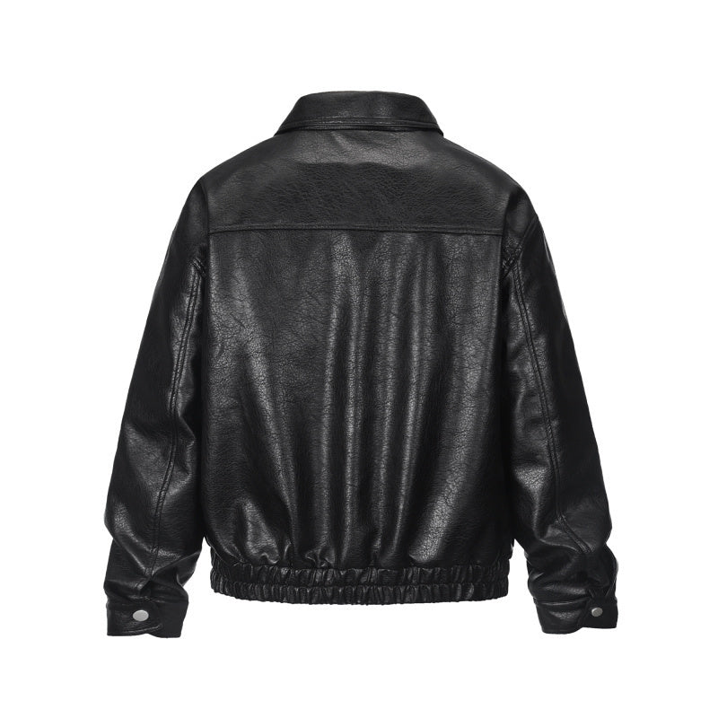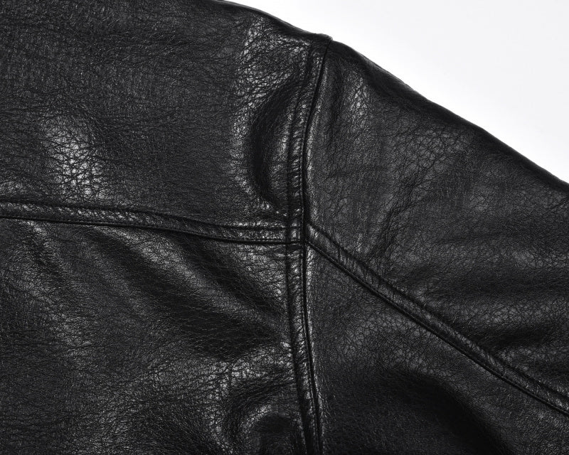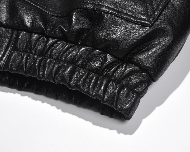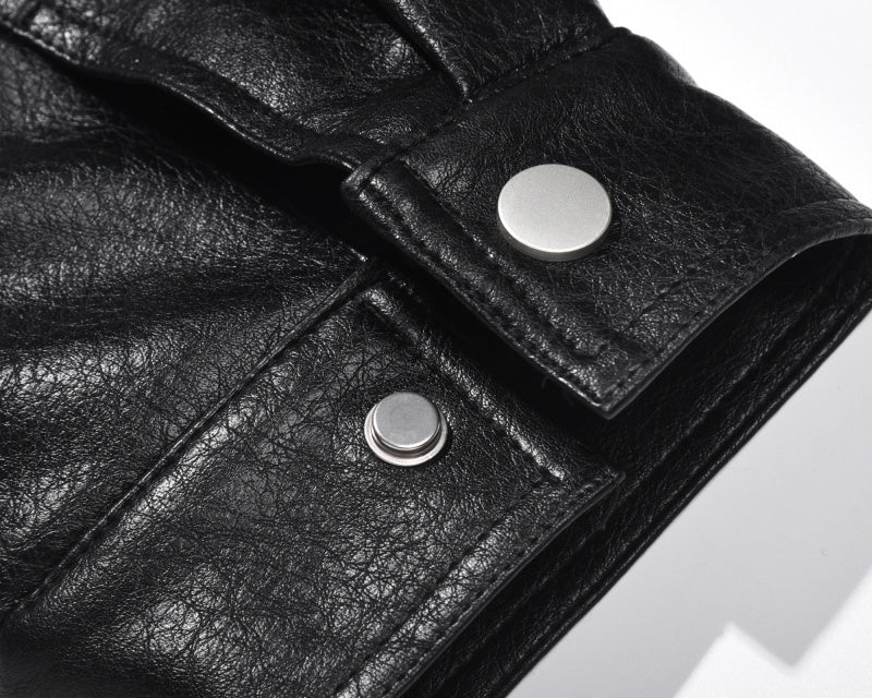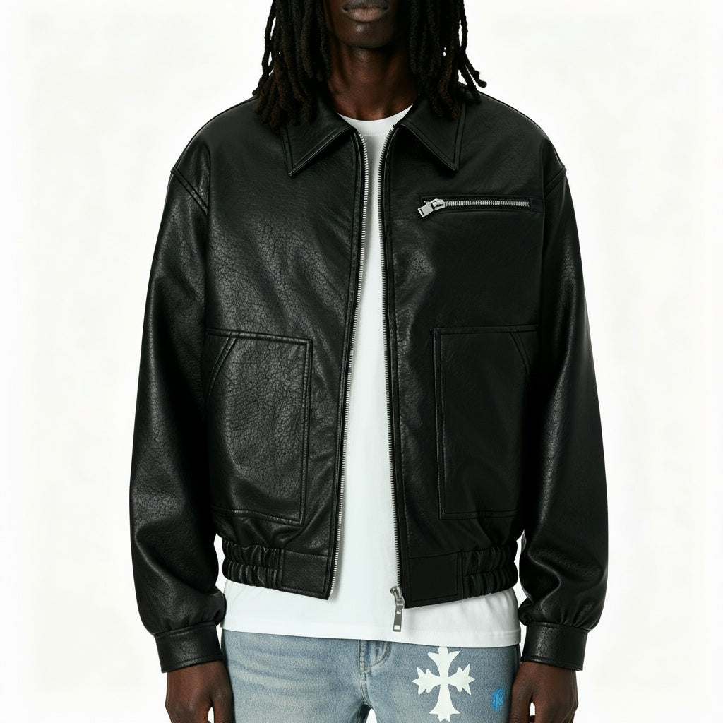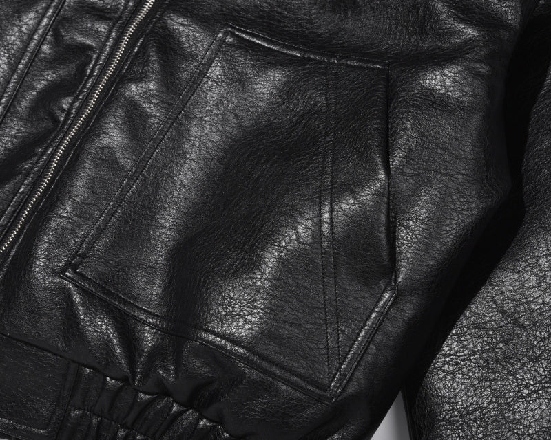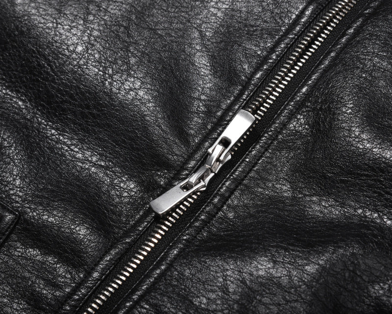 Giacca in similpelle con cerniera. Polsini elastici in vita, chiusura con bottoni automatici sui polsi e doppia cerniera sul pannello frontale. Foderata internamente in piumino, perfetta per l'inverno in Europa e nel Regno Unito, con temperature da 5°C a 41°F a 20°C.