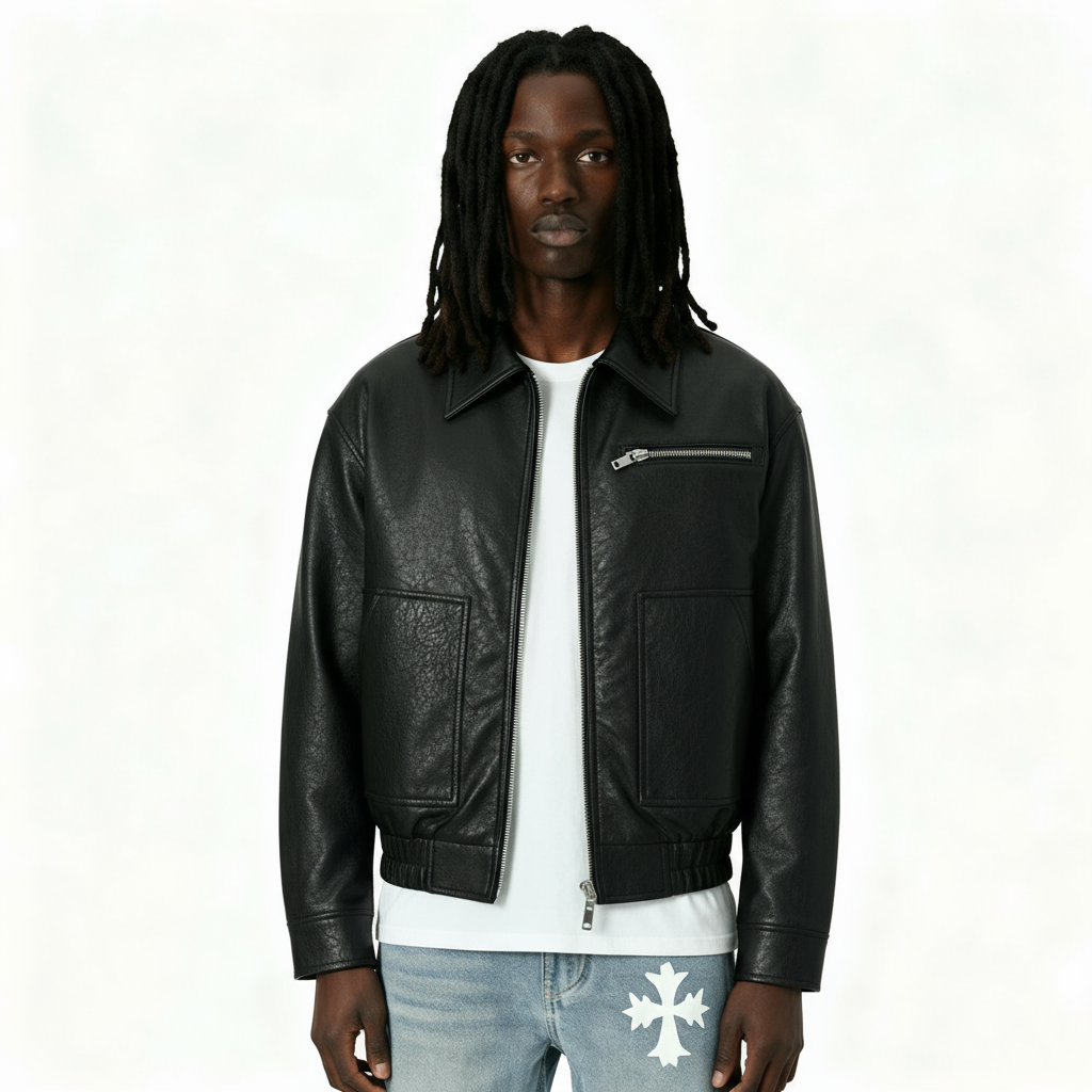 Home /TOPS/ Giubbotto bomber in pelle da motociclista | Ossidiana