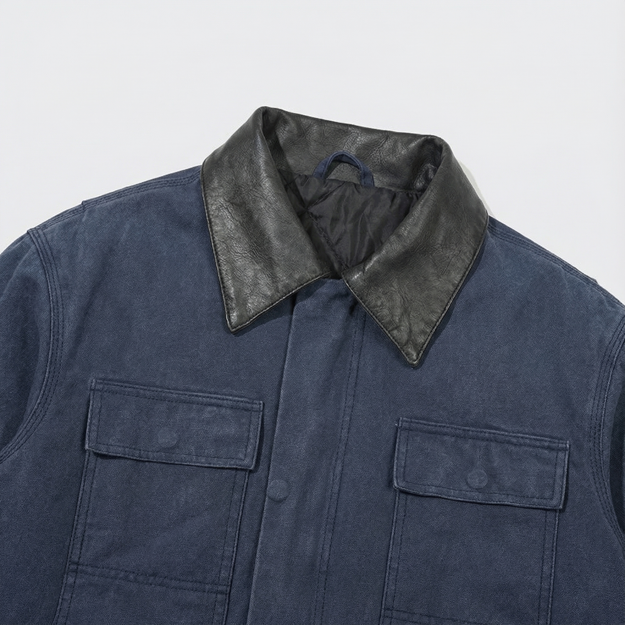 Giacca in tela d'anatra resistente, realizzata in tela d'anatra lavata da 12 once per un look vintage. Abbinata a una pelle tinta nera a contrasto. Chiusura con bottoni.