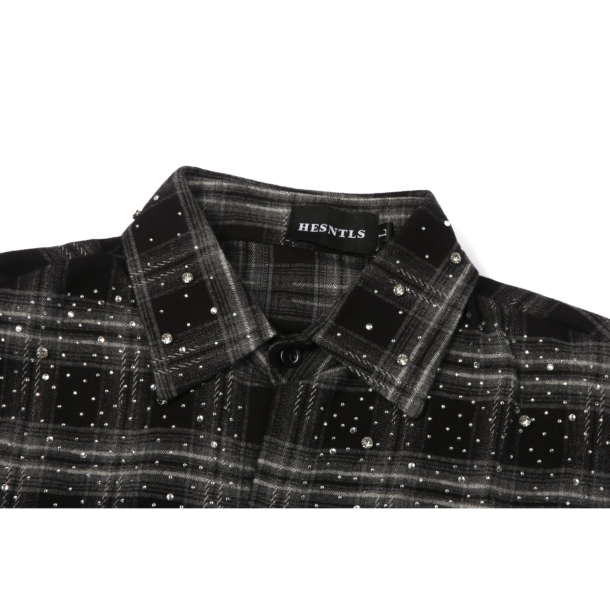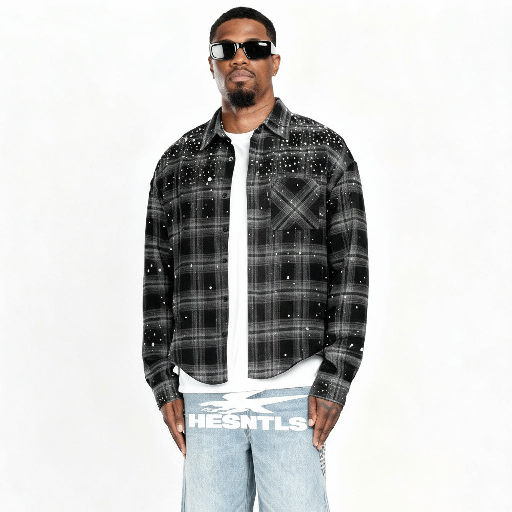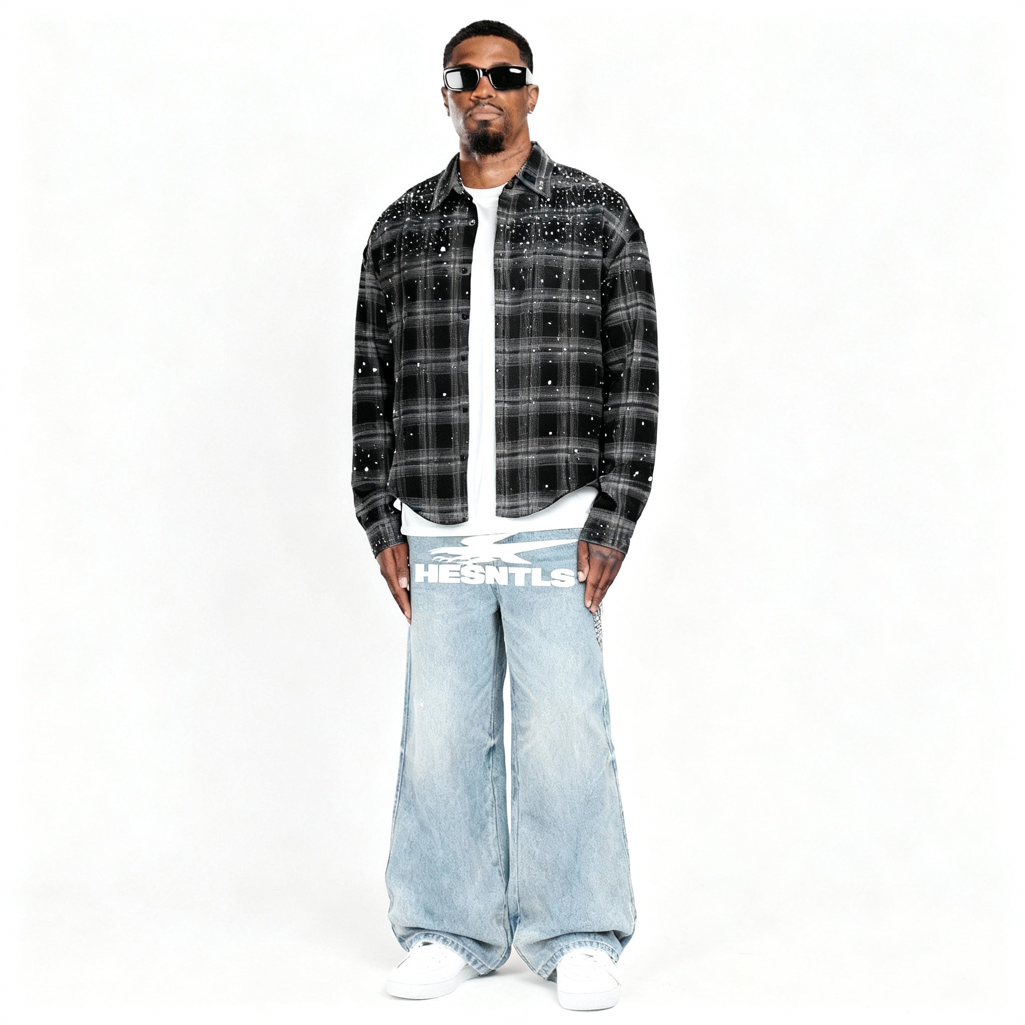 Realizzata in chambray di alta qualità, realizzata a mano e su misura per una finitura di alta qualità, la camicia Vintage VVS Flannel presenta intricate forme di pietre su tutta la superficie. Il capo perfetto per distinguersi, da abbinare a un look aderente o da indossare a strati per l'autunno.